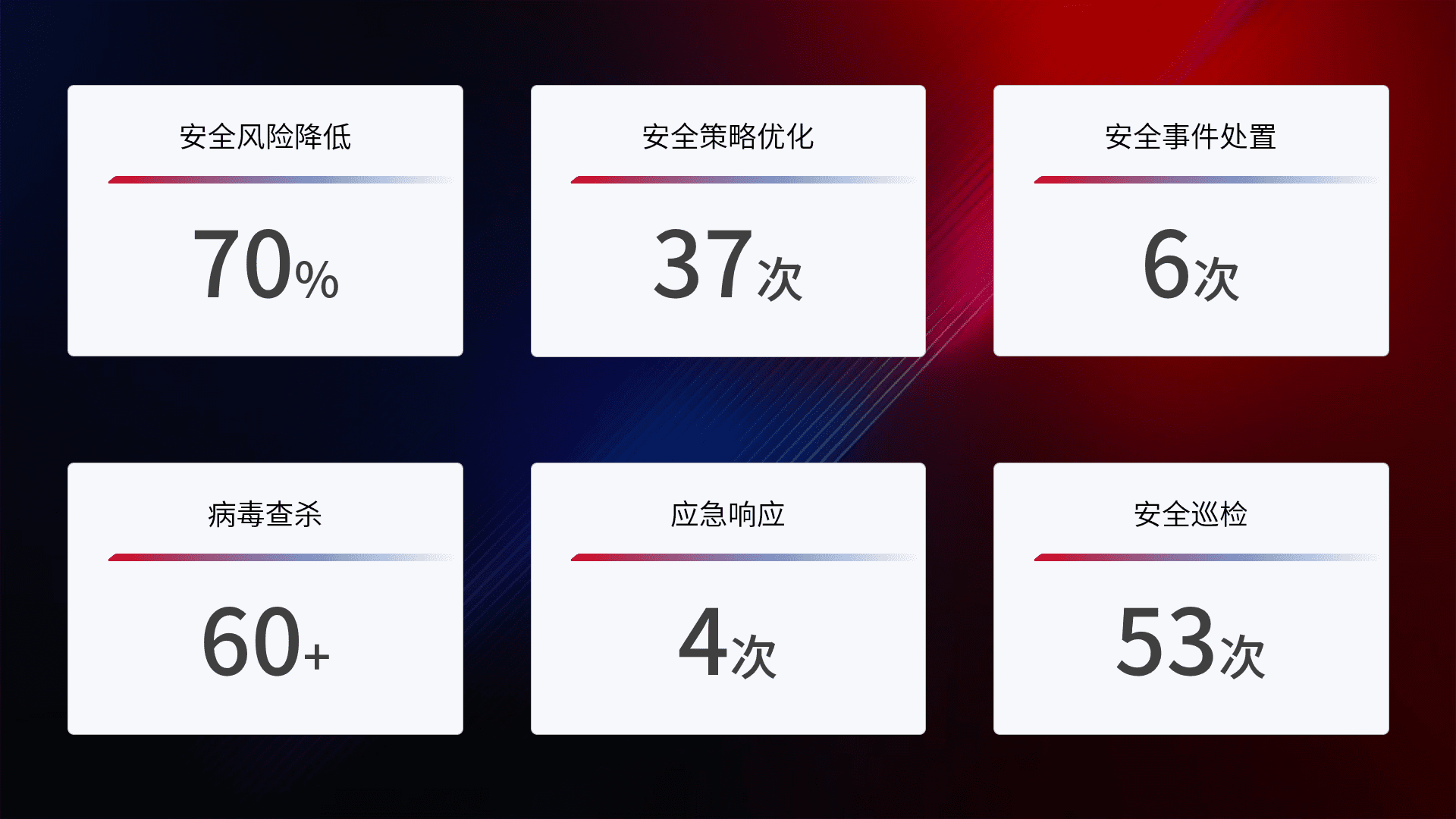 提供全面的安全事件报告体系,,包括处置报告、、、周报、、季度和年度总结,,,,结合持续监控,,帮助客户深入了解网络安全状况。。。