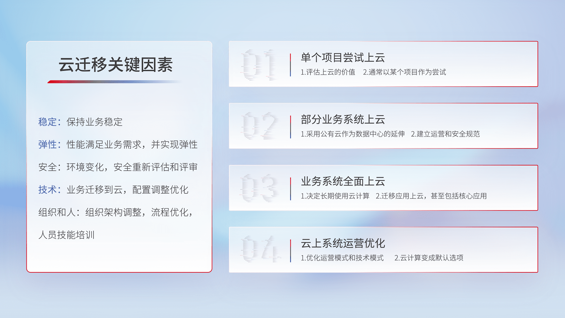 结合实际业务,,,,从规划设计、、、云平台选型、、、云原生改造、、、、数据迁移、、集成交付,,,,迁移全过程为客户识别最佳上云路径,,,,做好风险识别管理,,设计网络架构、、、身份权限、、、安全审计合规、、、操作审计、、日志审计、、监控告警策略、、、、多站点容灾设计等,,,,对云上基础设施进行整体规划,,提升IT治理水平,,,以满足弹性、、、高可用、、、高性能的需求。。。