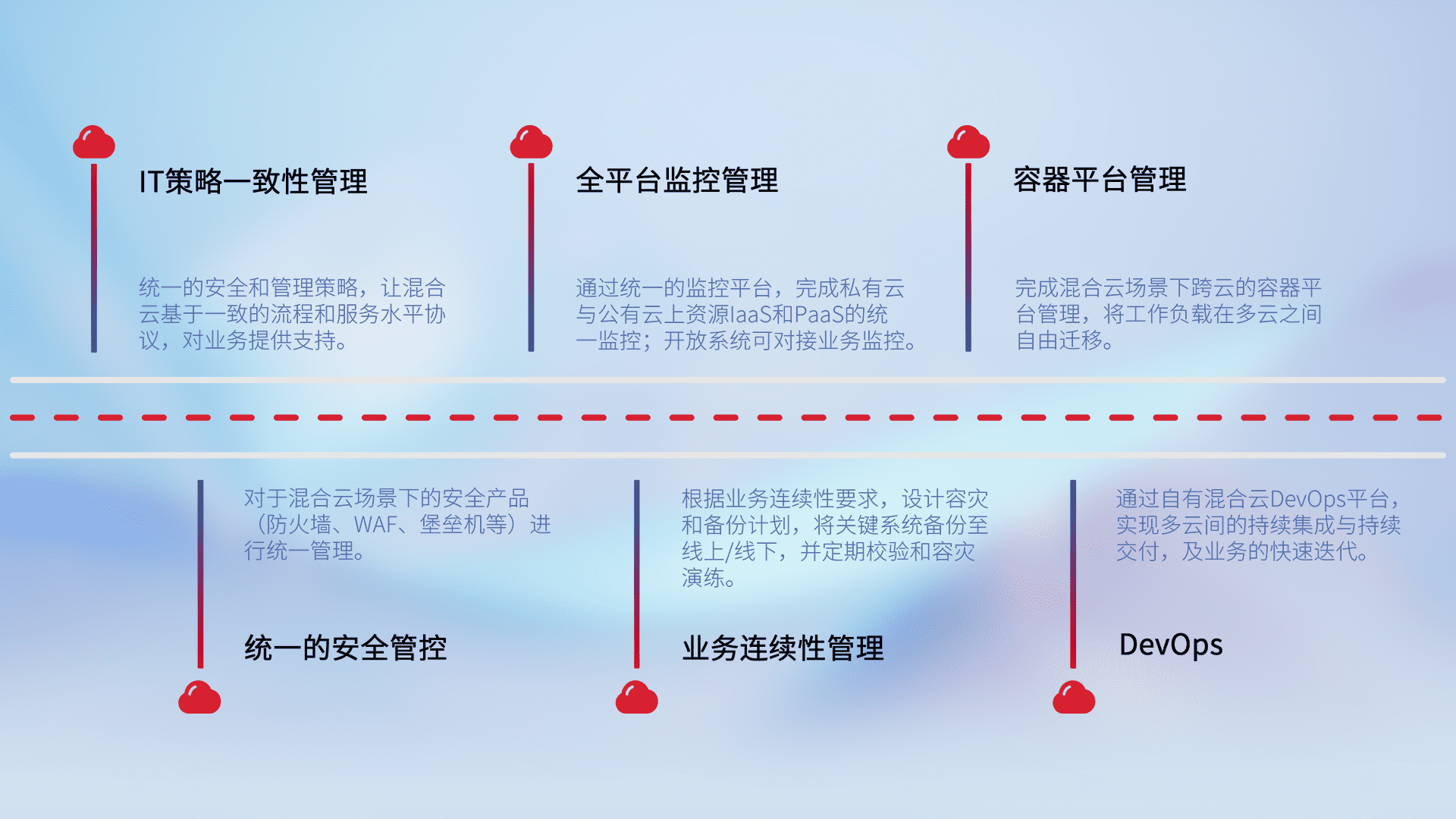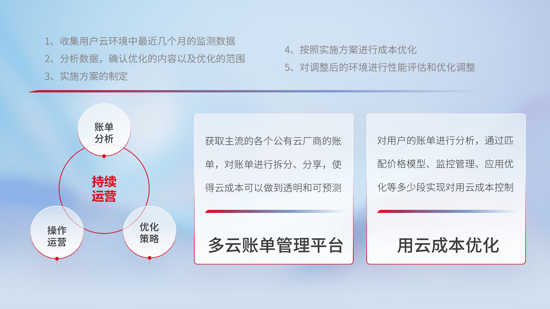 通过多云纳管,,以统一的资源数据模型把客户的云资源进行抽象和封装,,进而实现对多云资源的统一操作,,保障云资源管理的可靠性、、、稳定性与可用性。。。量身定制化运维内容,,,配置、、、开发运维、、、补丁管理、、备份、、、监控、、认证和访问管理、、审计和日常巡检等,,,,保障在用云过程中的可靠度,,,稳定度以及高可用率。。。